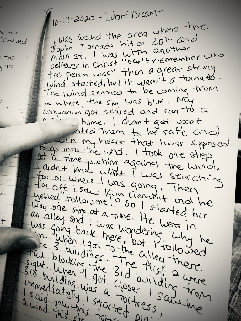 In this dream I started in Joplin Missouri, where the Joplin tornado hit 20th and main street. I was with another believer in Christ, but I can’t specifically remember who the person was. Then a great and strong wind started, but it wasn’t a tornado. The sky was blue and the wind seemed to be coming from no where particular. My companion got scared and ran to a close by home. I didn’t get upset because I wanted them to be safe and I knew in my heart I was supposed to go into the wind. I took one step at a time, pushing against the wind. I didn’t know what I was searching for or where I was going. Then afar off I saw the prophet, Kim Clement, and he yelled, “Follow me!.” So I started his way one step at a time. He went down an alley and I wondered why he was going back there, but I continued to follow him. When I reached the alley there were 3 buildings. The fist 2 were very tall, blocking the 3rd building from sight. As I drew closer I noticed the 3rd building was a fortress. I immediately started praising God. I said only this fortress could withstand a wind this strong. At that point Kim Clement and his wife were present and morphed into wolves. Kim was a big white wolf and she was a darker brown and had black tipped ears that stood out to me in the dream. Their tails were fish tails as well. I followed them into the fortress and it reminded me of the inside of a hospital. I saw Zebulun and he was a white wolf in this dream, we embraced each other for a long time. I kept telling him how much I loved him. Then I continued to follow the Clements. Wolves were coming here for rest and to be restored to health. The Clements told me their children come here. They continued that their children had to go out into the winter, but would come back to this place. For their children to grow they would have to leave. They said I would need to let my children go so they can grow. Then they took me outside to a training area. Their oldest daughter was maneuvering the course like a pro, completing flips as if it was nothing. They stated she had been out in the winter the longest and exclaimed, “Now look at her!” The dream ended when Mrs. Clement said, ” I bet you wonder why my ears are different.” Then she took out a fish and behind it revealed a huge scar where part of her skull was caved in. It was a healed wound. She said, “It’s because of this wound I have a place to keep nourishment so I can stay in the winter longer. I will eat this for strength.” I turned around and noticed Kim had a huge wound to his head and realized he wasn’t even alive anymore. Then I woke up.